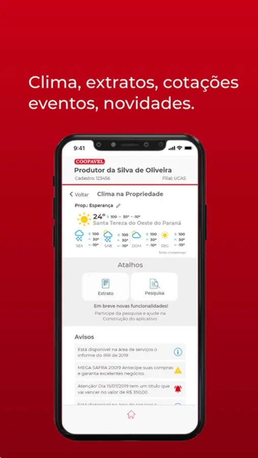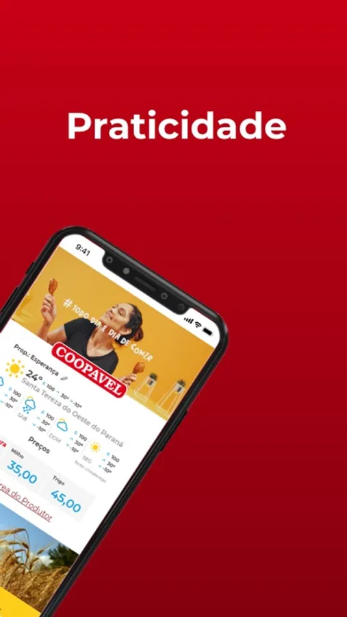 O aplicativo do Produtor Coopavel reúne em um só lugar o acesso a informações relevantes para os produtores da Coopavel, tais como clima, cotações, extratos e eventos, tornando-se assim um excelente canal de relacionamentos.