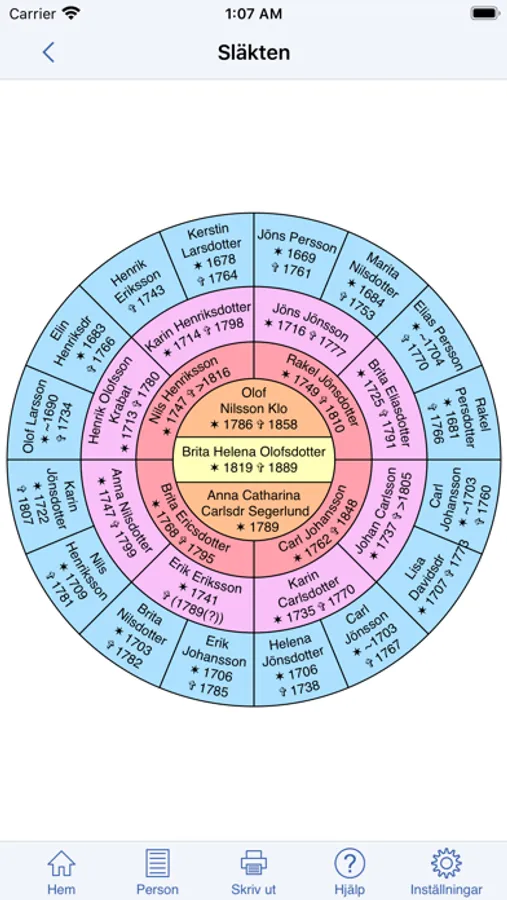 * En cirkulär vy som visar en persons anor