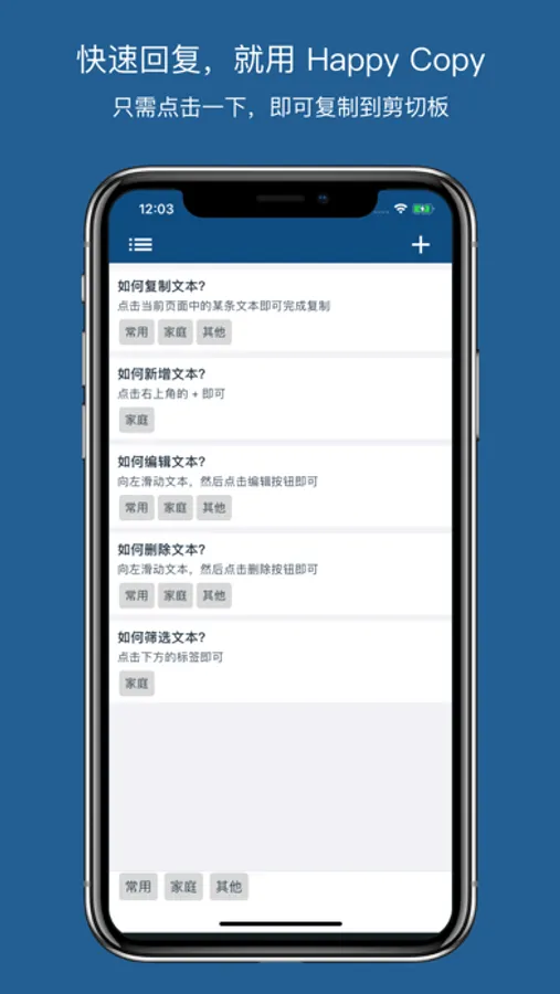 生活中,工作中,我们时常会遇到需要重复回答的问题,比如你的家庭住址,比如你的银行卡号,比如客户询问你的商品详细。以往,你需要打很久的字,或者去找寻很久才能找到回答;现在,你只需第一次保存到 Happy Copy,下次你就可以瞬间完成。
