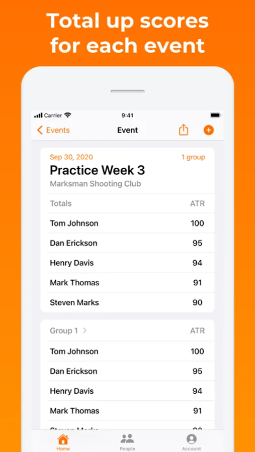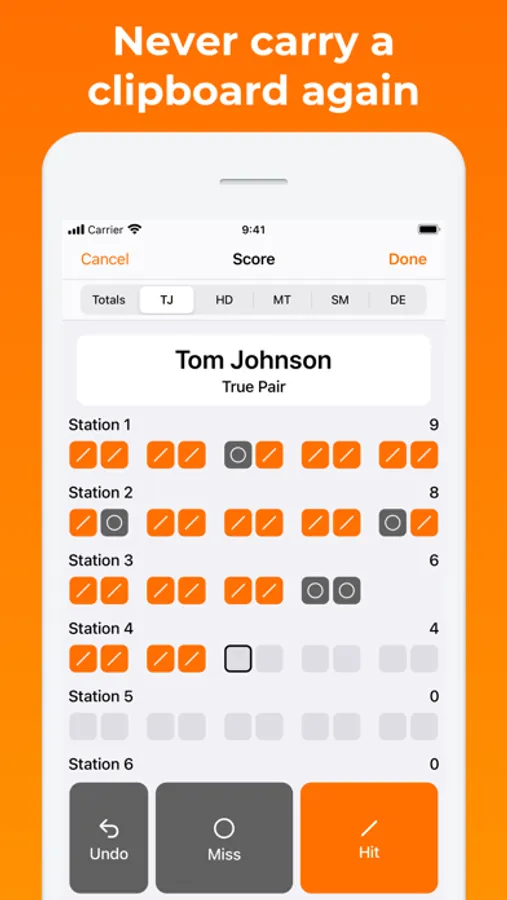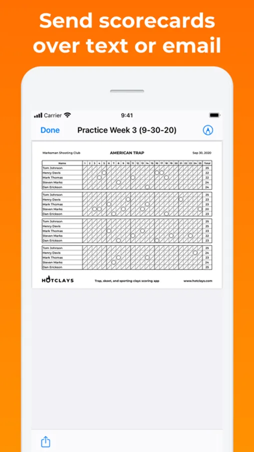 Just tap hit or miss to score. Total up scores for each practice. Send scorecards over text or email. Backup your scores for free, and sync between devices to score multiple groups at once.