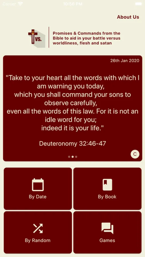 Verses Versus app brings you a collection of prayerfully selected Bible Verses to help you in your spiritual struggles. Use these Promises & Commands from God’s Word, the Bible in your battle against the world, the flesh and satan. Swords up!