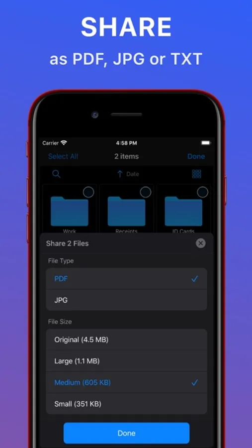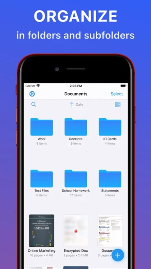 Go paperless by storing all your documents in folders and subfolders on your iPhone/iPad.