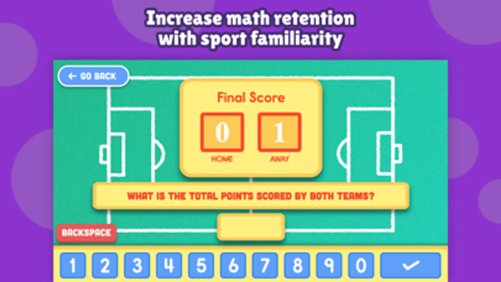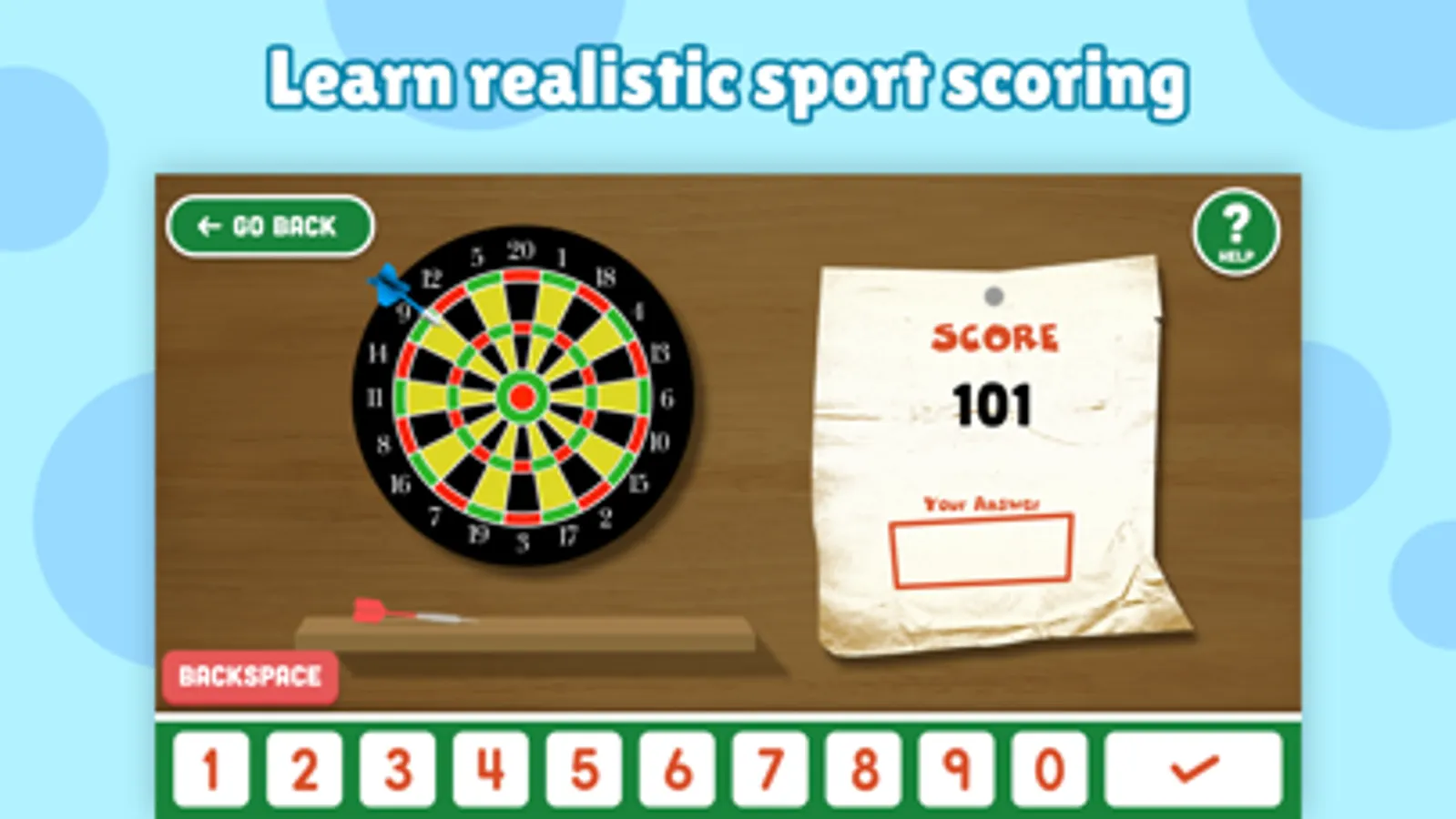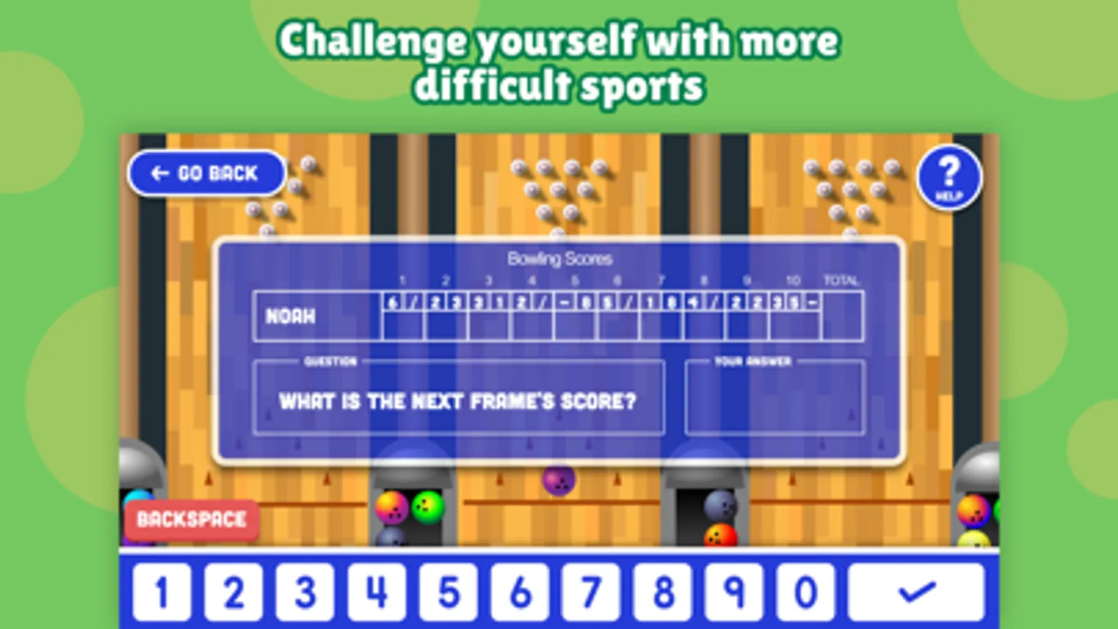 Each sport provides a different challenge. Soccer, hockey and baseball provide smaller numbers while football, basketball, bowling and darts provide double and triple-digit numbers. Golf uses single and double-digit integers. Finally, running, swimming, and drag racing allow the user to practice facts with decimals.