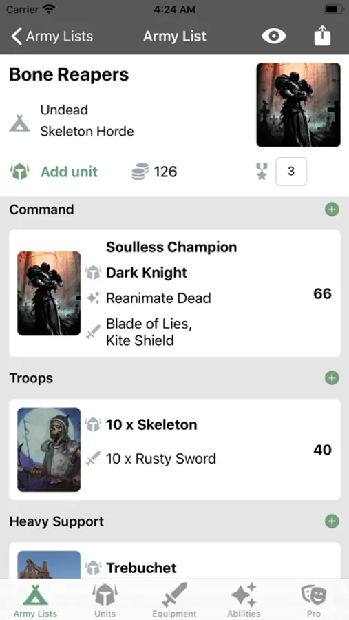 Manage your unit entries and points from within the app. By once entering the units, equipment and points from your army book or annual points update book manually you can then use the app to quickly and effectively make detailed army lists. In testing we have found a typical game system army book takes around 20-30 minutes to input into the app. Alternatively, you can browse and import public BSData from within the settings page instantly.
