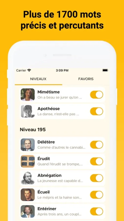 Avec Avocab, enrichis ton vocabulaire et gagne en éloquence facilement tout en te cultivant avec les citations d'Einstein, Mandela, Coluche, Voltaire et bien d'autres.