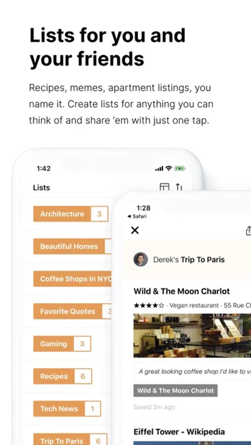 Recipes, memes, apartment listings, you name it. Create lists for anything you can think of and share ‘em with just one click.