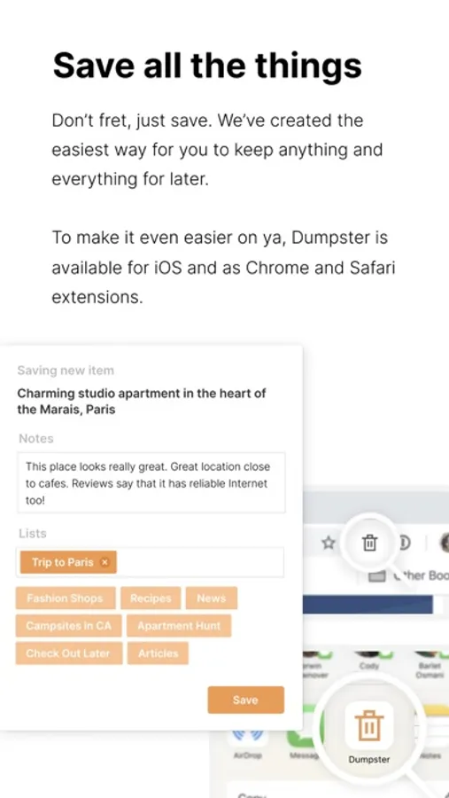To make it even easier on ya, Dumpster is available for iOS and as Chrome and Safari extensions. Learn more about our apps by visiting http://dumpster.app.
