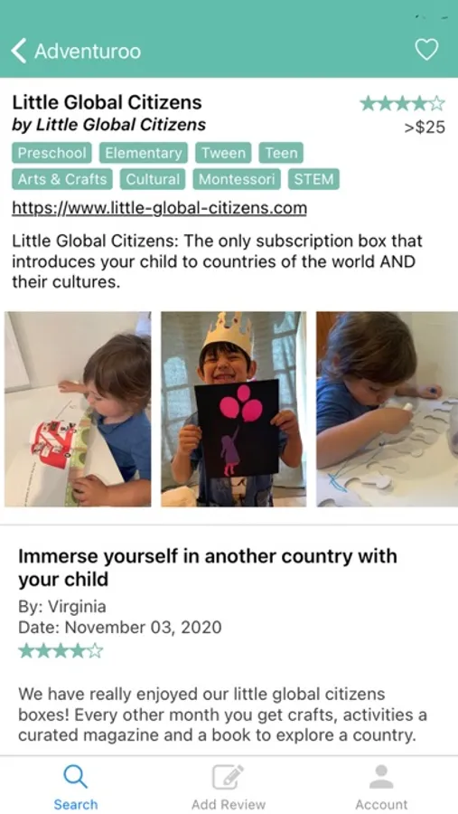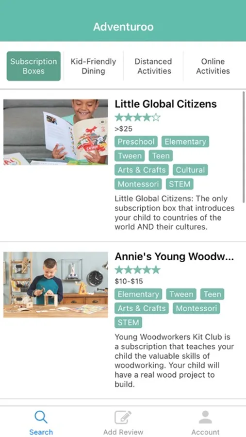Adventuroo connects families with engaging activities, at-home experiences, and kid-friendly dining. You can find an array of subscription boxes, reviewed by parents, for inspiring and enriching at-home projects, as well as family-friendly restaurants so you can truly enjoy your dining experience.