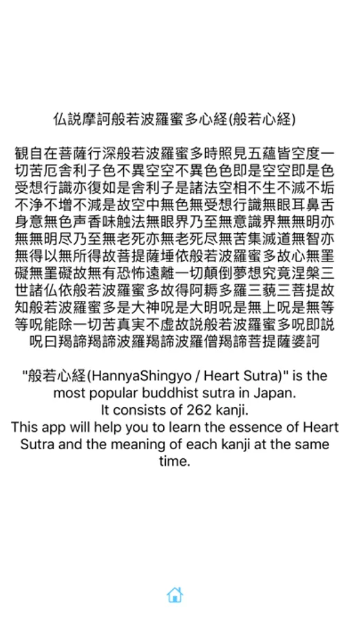 This app will help you to learn the essence of Heart Sutra and the meaning of each kanji at the same time.