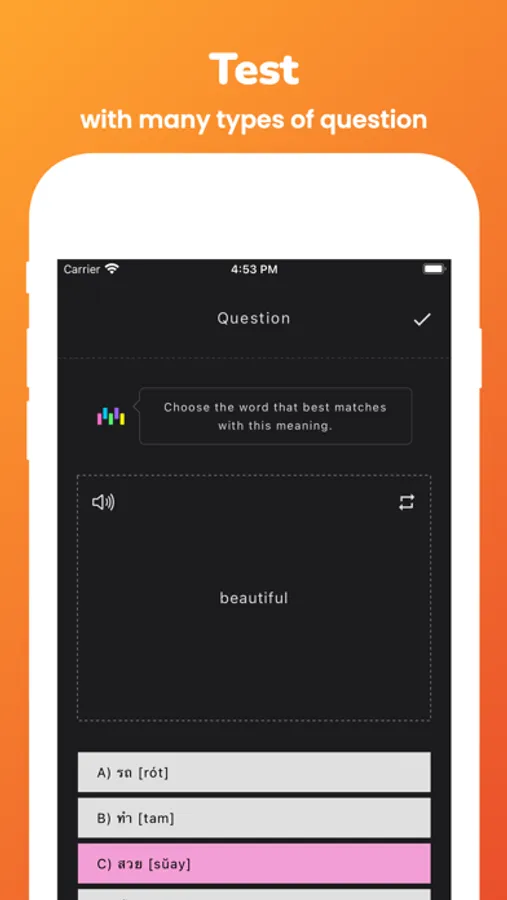 -Support many types of test for learning Thai (Multiple choice question, listening, matching, flipping flashcard and etc.)