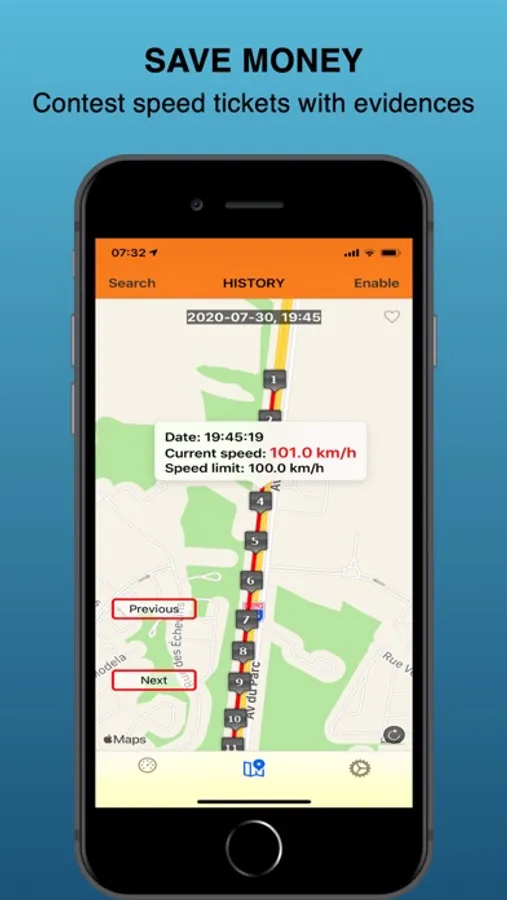 Every 5 seconds, ByeByeTicket stores locally your current speed and the road speed limit when available. You can later contest a speed ticket by showing the stored information.