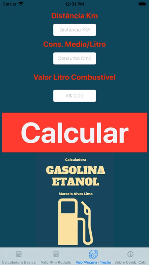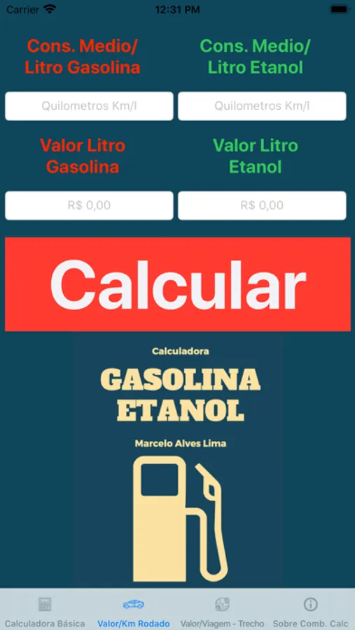 Calcule o combustível mais vantajoso, o valor por quilômetro rodado com Gasolina ou Etanol, e calcule também valor gasto por viagem.