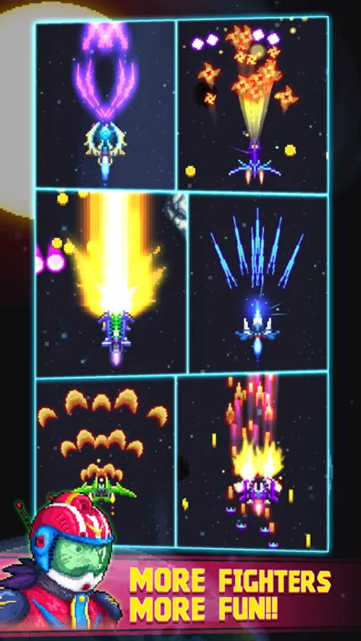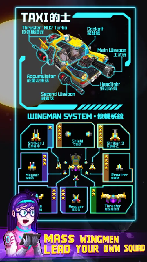 * Innovative wingman system. You can pick up eight wingmen from your vast Arsenal and fight for you at the same time. These wingmen have expertise in attack, defense, replenishment, ability bonuses, etc. The best team can be selected according to the combat objective.
