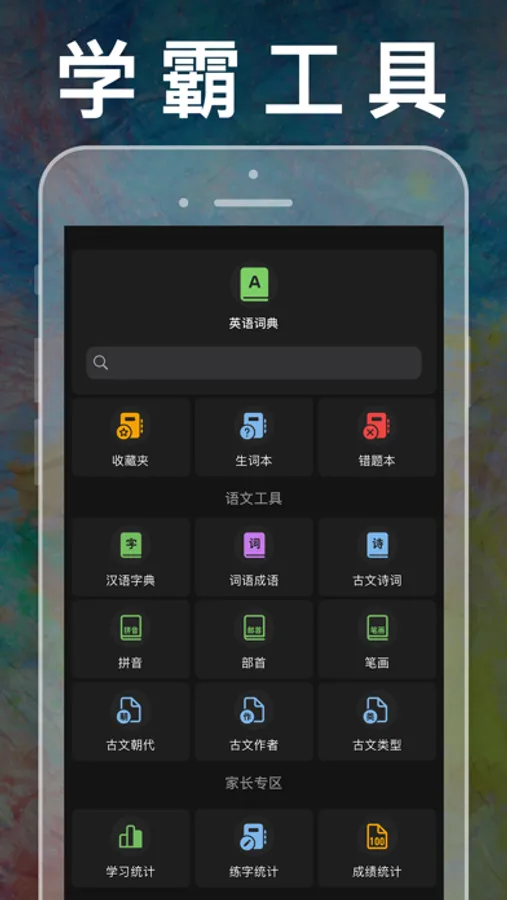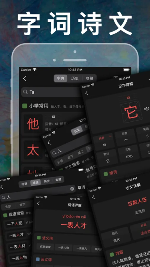3、汉语字典、拼音、笔画、边旁部首搜索功能;