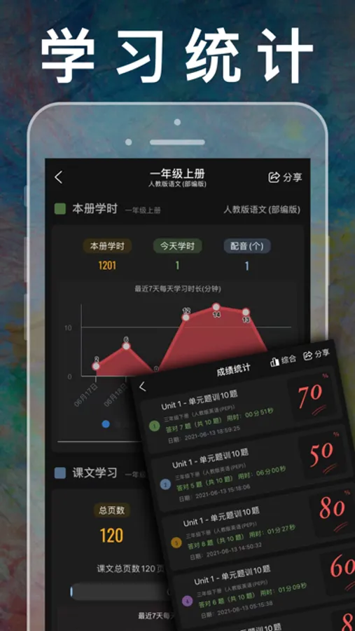 学习成就:图表统计学习情况,孩子的学习情况、训练成果五目了然。