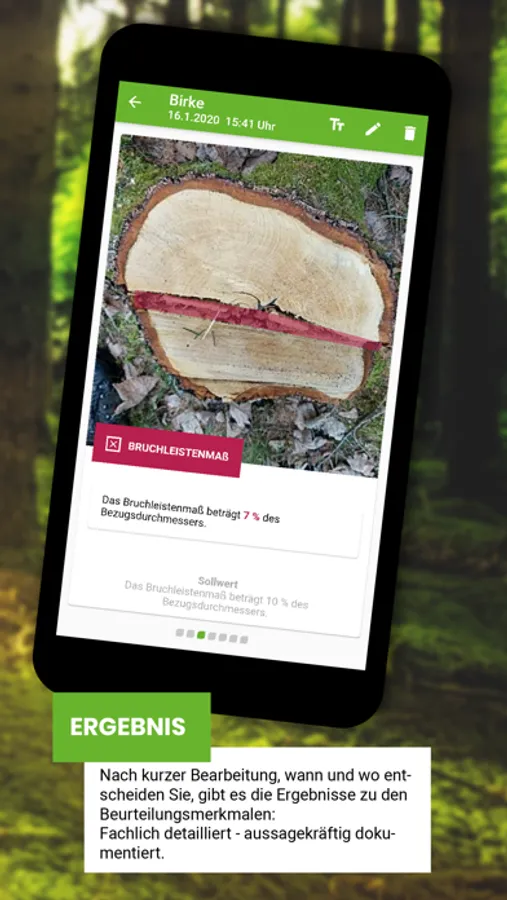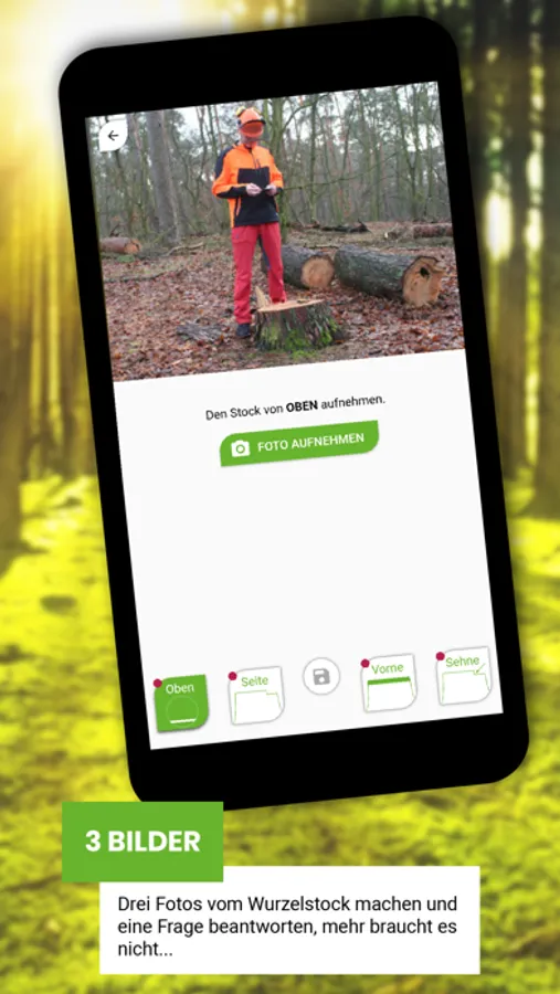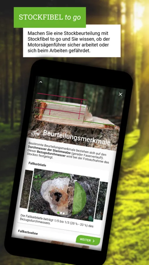 Funktionen wie Stockbilder fotografieren, Beurteilungsmerkmale aufnehmen, Stockbilder und Ergebnisse speichern und verwalten sowie praxisnahe Informationen und Hilfen, ermöglichen eine einfache Anwendung mit Wissensangebot. Stockfibel to go gibt Informationen zu den vorgeschriebenen Fachkundemerkmalen und dokumentiert gleichzeitig die handwerkliche Ausführungsqualität der Motorsägenarbeit bei der Baumfällung.