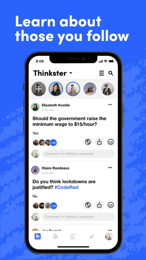 Thinkster is THE platform for determining public opinion on any topic. Learn the views of the world, gain valuable insight into the opinions/ beliefs of those you're following, and discover like-minded, compatible individuals!