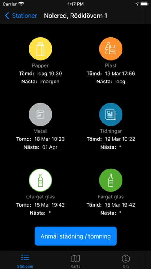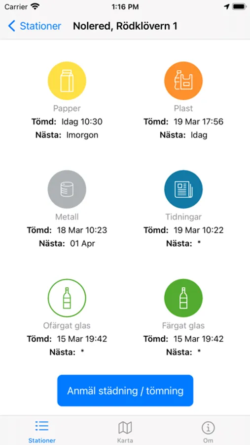 * Status på återvinningsstation - När du valt en station kommer du till denna vy. Här ser du status på när varje typ av behållare har tömts och när nästa planerade tömning är.