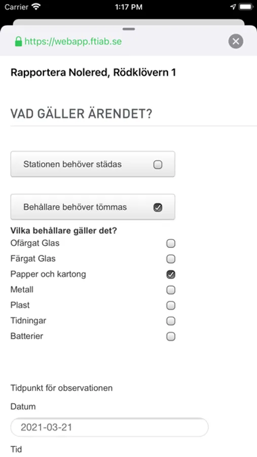 * Rapportera återvinningsstation - Om stationen behöver städas eller någon behållare tömmas kan du enkelt rapportera detta till FTI direkt från appen.