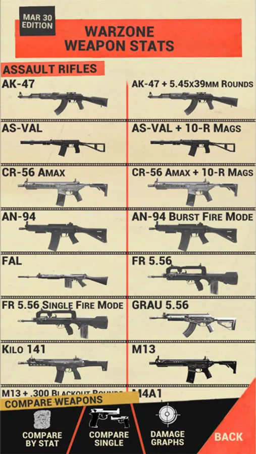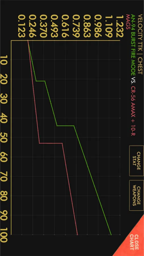 • Compare your loadouts or create custom charts based on any of the 50+ different stats including DPS, TTK, recoil, ADS, velocity and more across any range in the game.