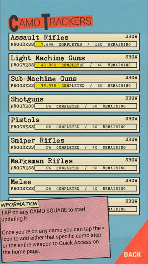 • Keep track of the current Camos you’re working on including completion percentages for each category