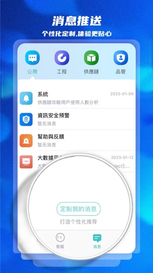 公司的商品良率,成本管控或者经营出现问题,会及时的推送消息给用户,缩短解决问题的时间,避免公司造成不必要的损失。