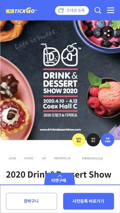 - 무료행사 정보보기를 선택하고, 행사정보 확인 후 간편 사전등록이면 전시장에 바로 입장~