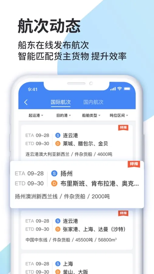 【航次动态】船东可在线发布自己的航次,智能匹配货主货物,减少国内、国际海运运输空载率,提高航运效率。