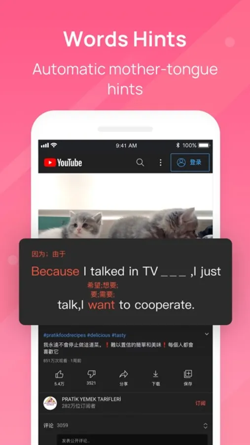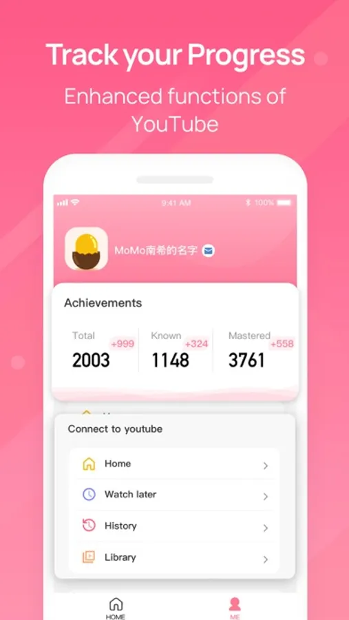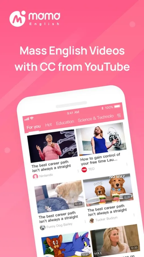 Momo provides an endless amount of English videos with English subtitles on YouTube for English learners, and makes personalized recommendations based on user's viewing history, and provides word hints, one-sentence loops, and native language translations to help English learners better understand the content of the videos.