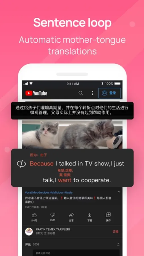 Sentences that you can't understand at one time are provided with a single sentence loop, showing native translation and full subtitles at the top, so you can fully understand each sentence easily.