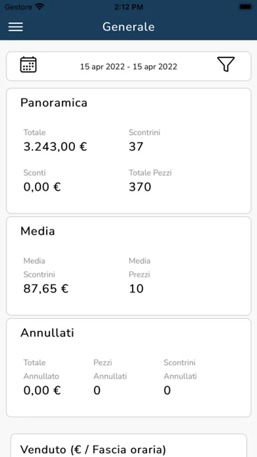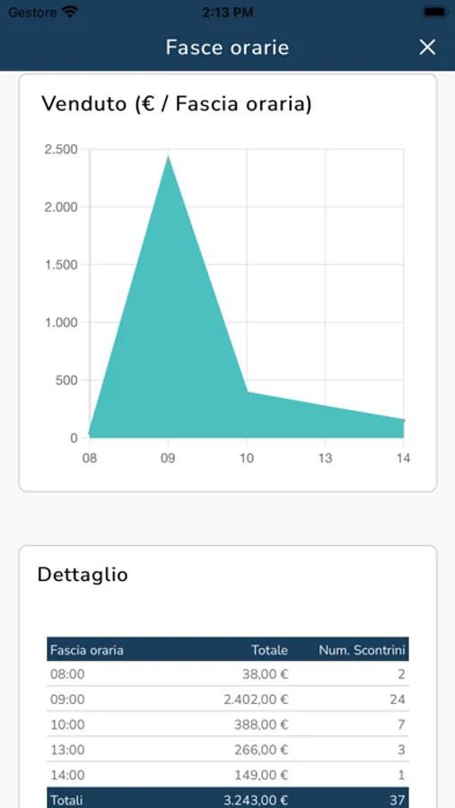 Consente di analizzare il venduto e il numero di scontrini per fasce orarie, evidenziando i momenti di maggiore e di minore affluenza.