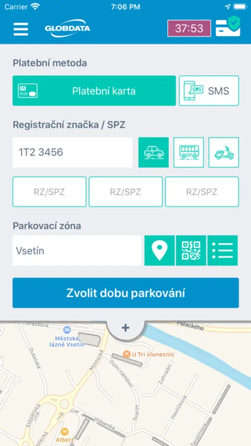 Pokud aplikace získá od uživatele oprávnění k načítání pozice zařízení je zakoupení parkovacího lístku otázkou zápisu registrační značky parkovaného vozidla a výběru doby parkování.