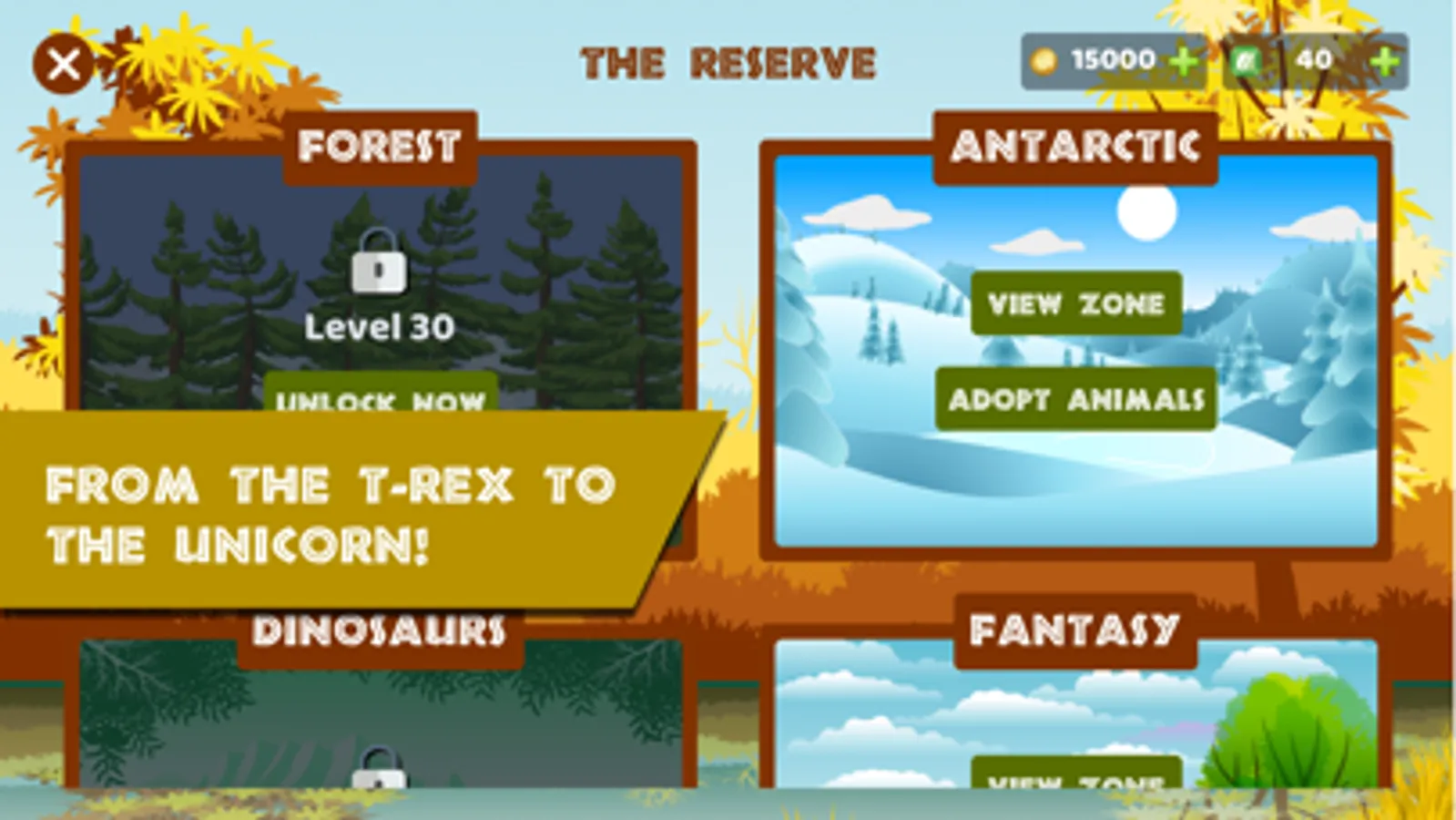 Settle your own Animal Reserve and unlock its different areas to accommodate them all. From farm animals to dinosaurs and fantastic animals!