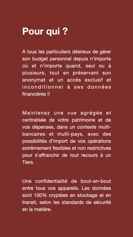 A tous les particuliers désireux de gérer son budget personnel depuis n’importe où et n’importe quand, seul ou à plusieurs, tout en préservant son anonymat et un accès exclusif et inconditionnel à ses données financières !!