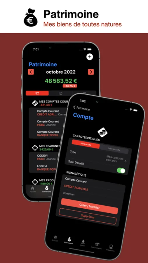 - Patrimoine : Inventoriez progressivement votre patrimoine (comptes bancaires, prêts, voitures, maisons …) de sorte à avoir une vision 360 de votre valeur financière