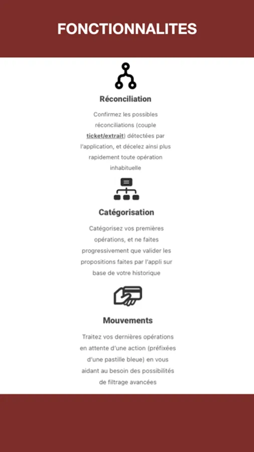 - Réconciliation : Confirmez les possibles réconciliations (couple ticket/extrait) détectées par l’application, et décelez ainsi plus rapidement toute opération inhabituelle