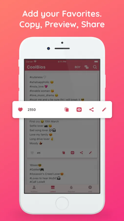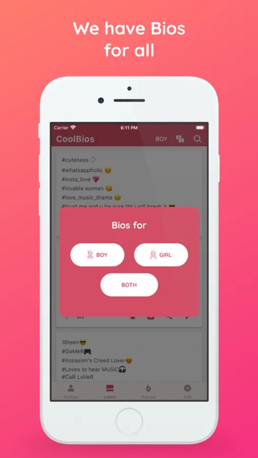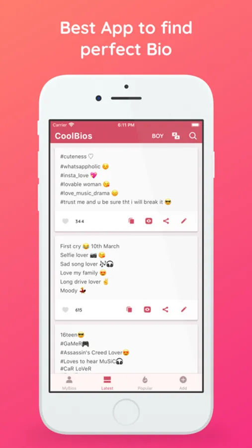 Read only what you need. Gender-based filtering helps a boy find attitude insta bio, and a girl can easily find some cute girly Instagram bios.