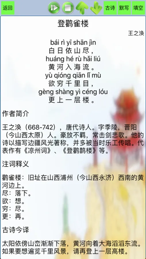 2.古诗模式下提供了古诗原文并标注拼音,古诗注解,赏析。并且根据每首古诗配了精美背景,和古诗文合理匹配,增加阅读兴趣。