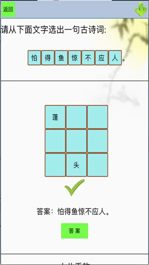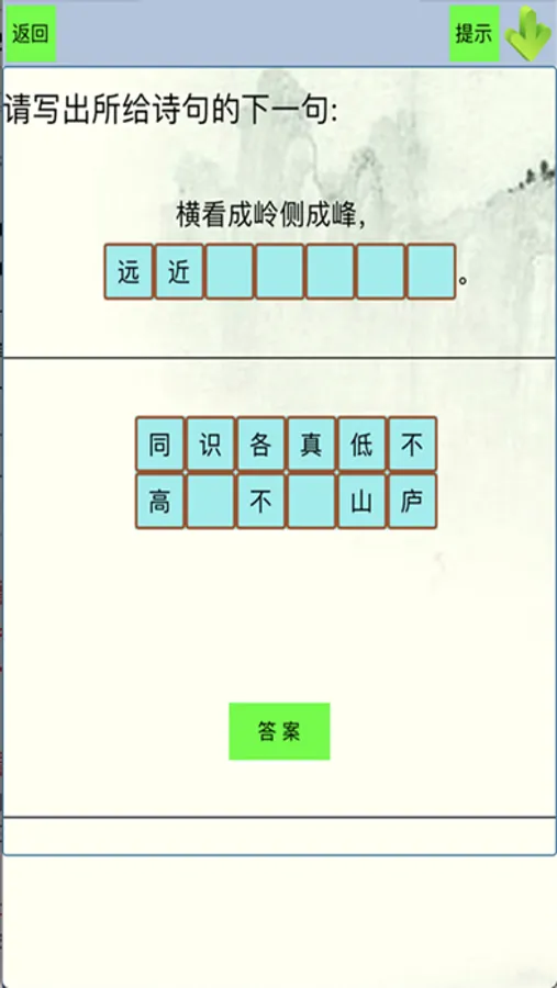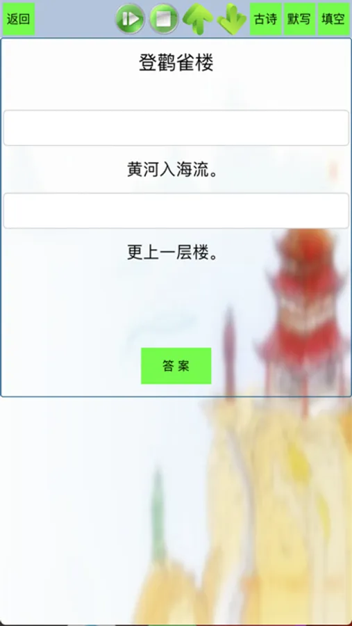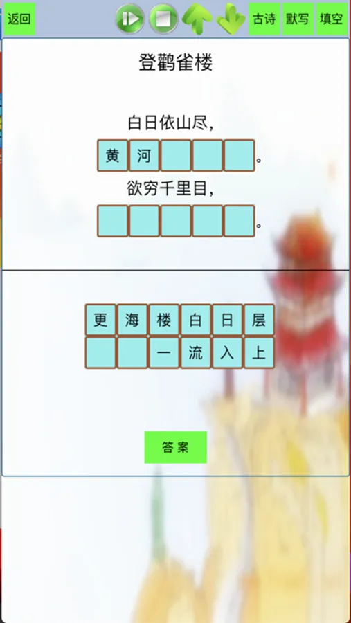 4.填空模式下用选字填空的方式帮助记忆古诗,每次自动生成不同诗句的填空内容。
