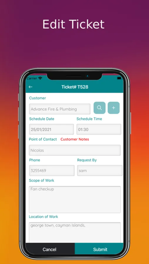Technician can edit ticket & they will have option add service items and there hours also if they used any inventory item for that job.