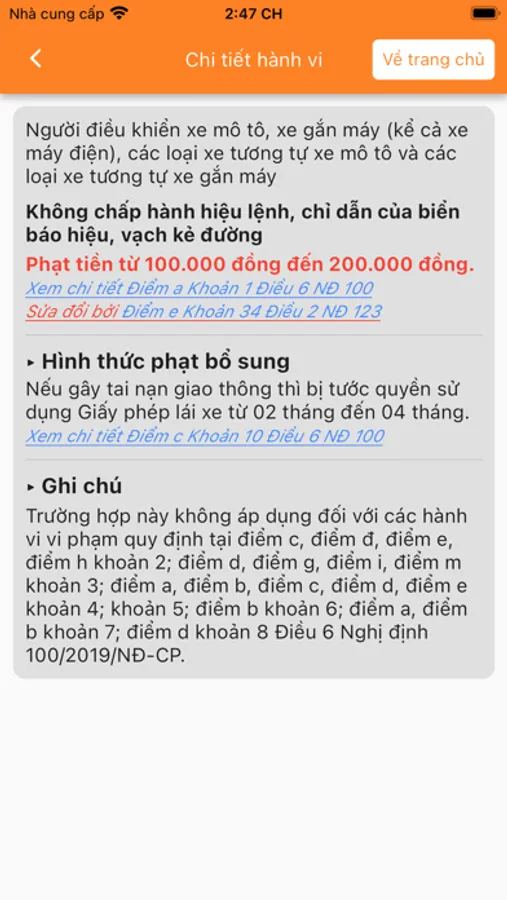 - Bao gồm tất cả các hành vi vi phạm giao thông đường bộ được cập nhật mới nhất theo Nghị định 100/2019/NĐ-CP cho 03 nhóm phương tiện là xe máy, ô tô và phương tiện khác.