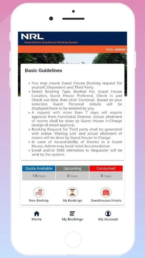 This application will facilitate NRL employees for online booking/cancel/view of NRL Guest Houses/ Transit Accommodations from their mobile.