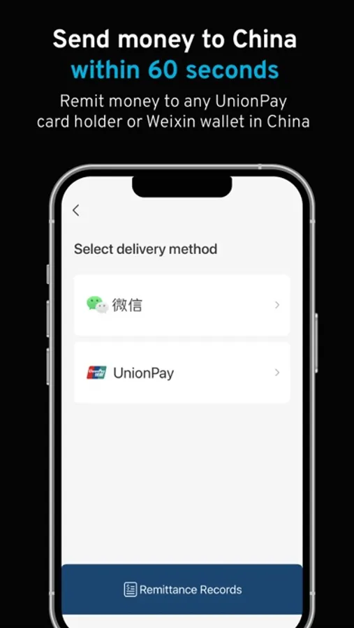 • You may send or receive money from UnionPay cards all around the globe, as well as send money to Weixin wallets in China in 60 seconds.