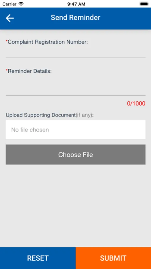 b) Dashboard: Easy dashboard containing Tabs to register a complaint, check status, send a reminder and see list of complaints lodged by the user.