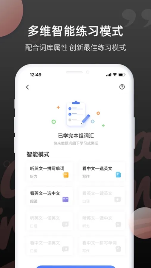配合词库属性,智能推荐最佳练习模式,多维度让你全面掌握单词!