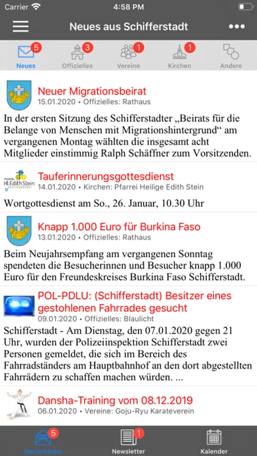 Hier werden verschiedenen Nachrichtenquellen aus Schifferstadt (Rathaus, Polizei, Vereine, Kirchen, ...) zusammengeführt. Dies bietet Ihnen einen schnellen Überblick über unsere Stadt.