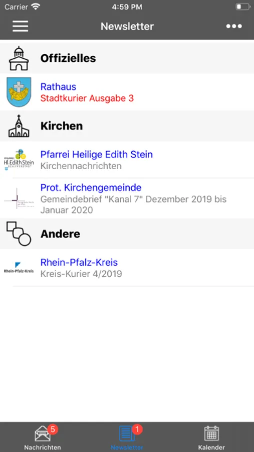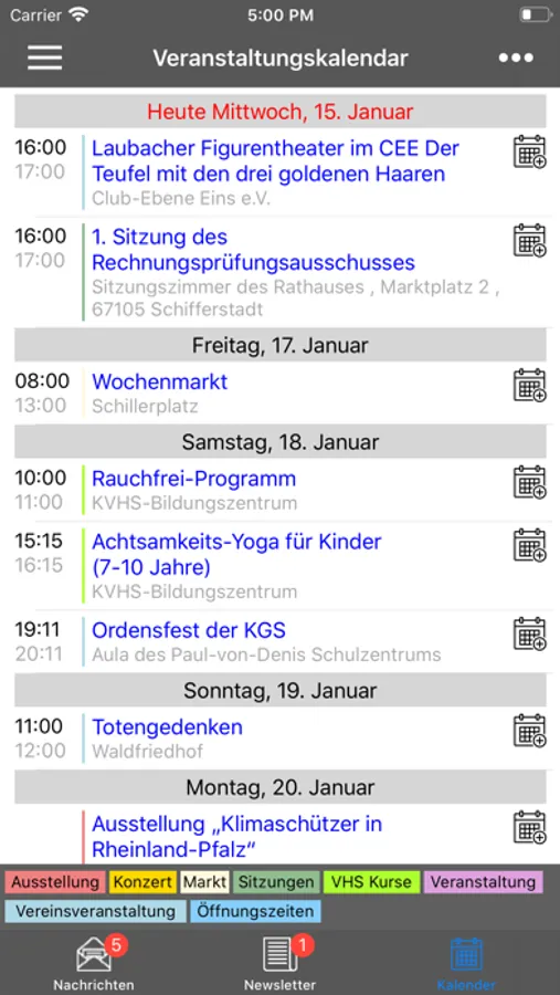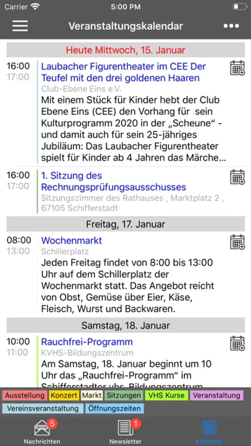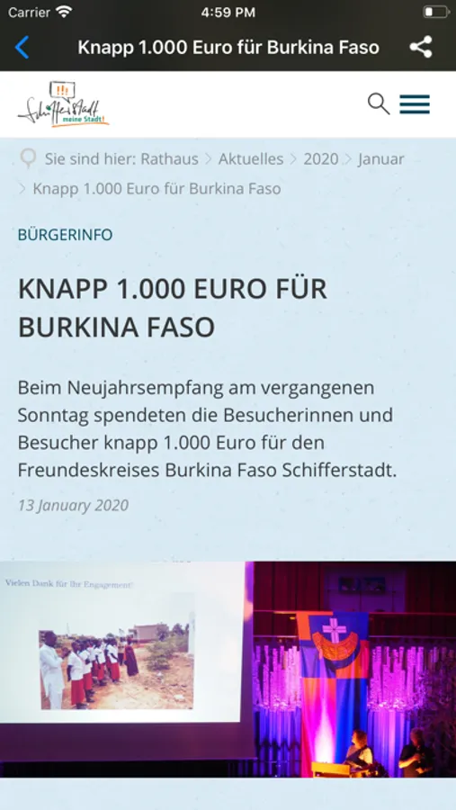 Dabei werden sowohl aktuelle Nachrichten, Newsletter als auch der Veranstaltungskalender der Stadt Schifferstadt angezeigt.