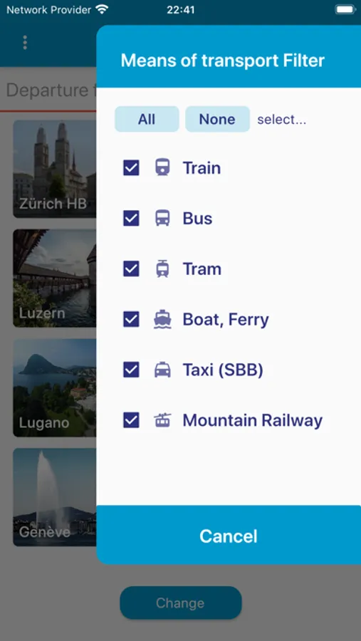 All you have to do is enter a place of departure (or select it from your favourites) and the next train, bus or tram connections are displayed. And this for the complete SBB timetable for Switzerland (including trains, buses, trams, boats, mountain railways etc.).