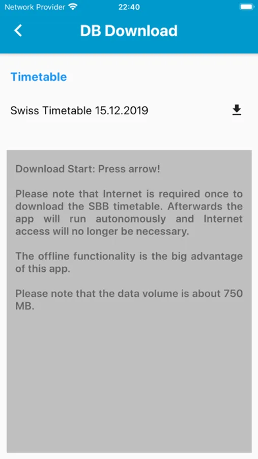 Please note that the data volume for the complete offline SBB timetable is approx. 640 MB.