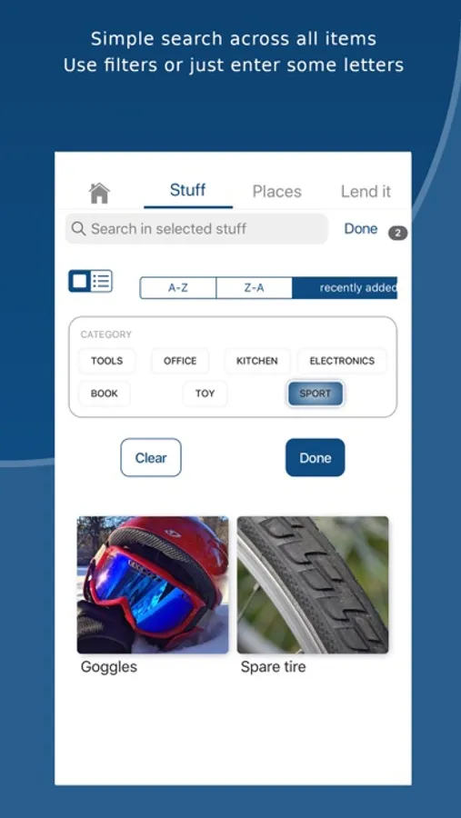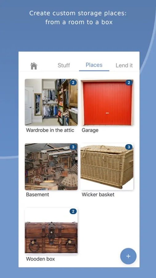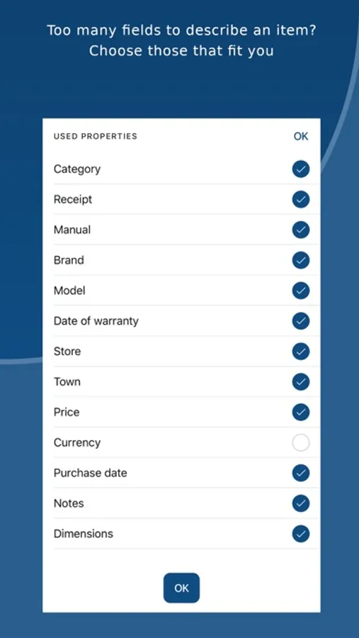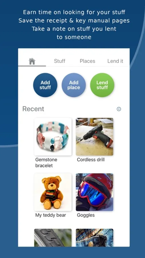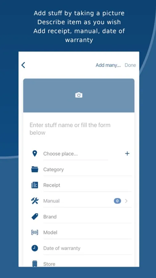 - Describe your stuff with: category, receipt, manual, brand, model, date of warranty, store name, town, price, currency, purchase date, dimensions, custom notes (each of these is of course optional :) ),